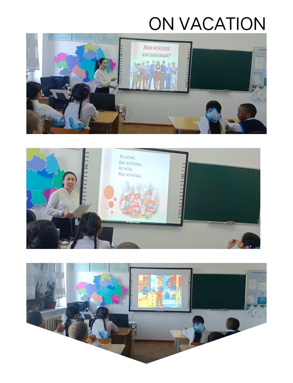 2024 жылы 11 наурыз күні 3 сынып оқушыларымен өткізілген «Мен өскенде кім боламын?» атты сұрақ-жауап, ойын сабағы. Мақсаты: Балалардың мамандық туралы түсініктерін дамыту, кеңейту. Мамандық ерекшеліктері мен пайдасын ажырата білуін үйрету. Балалардың сөздік қорын молайтып, байланыстыра сөйлеуін жетілдіру. Тілін дамытып, әр бала өз ойын еркін айта білуге дағдыландыру. Әр мамандық түріне керек құралдарын білуге үйрету.