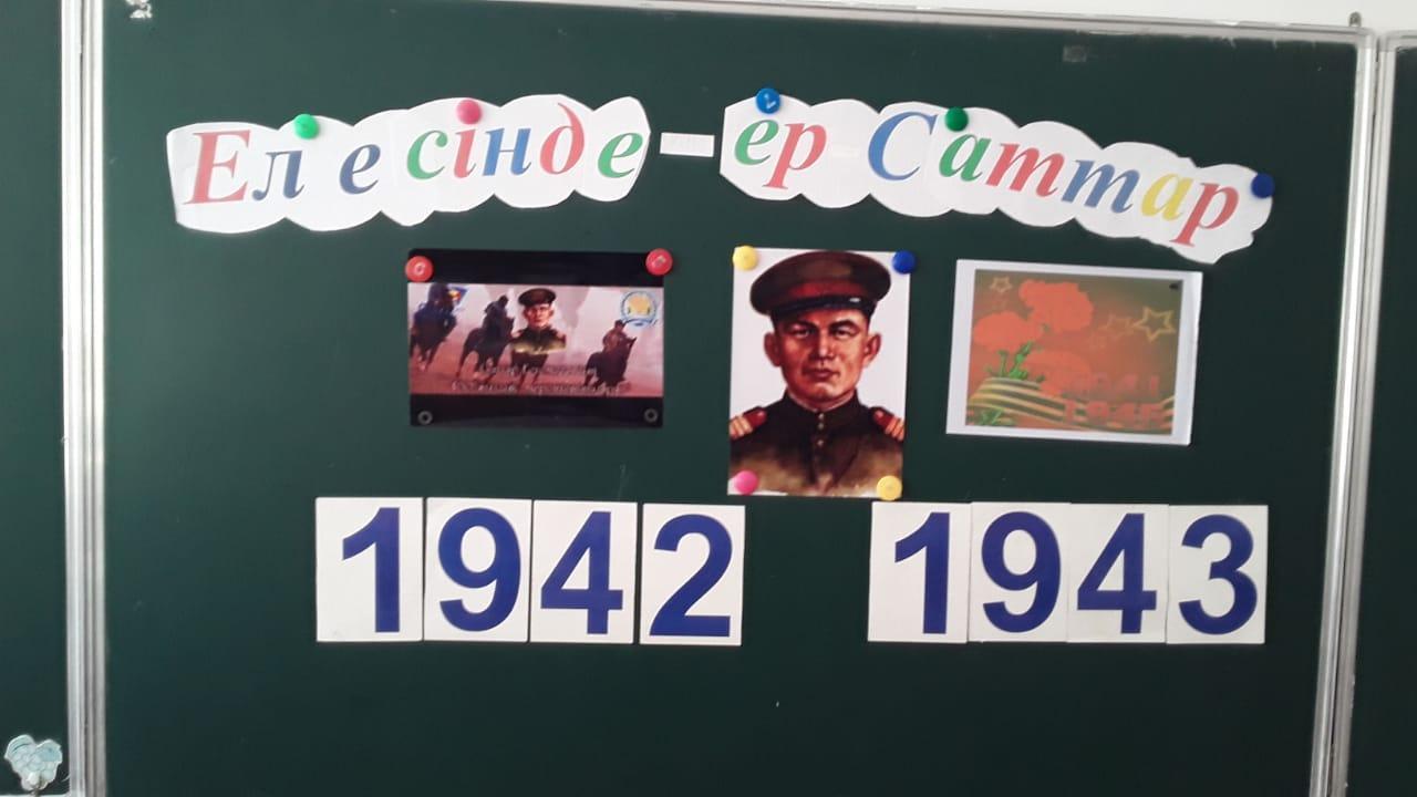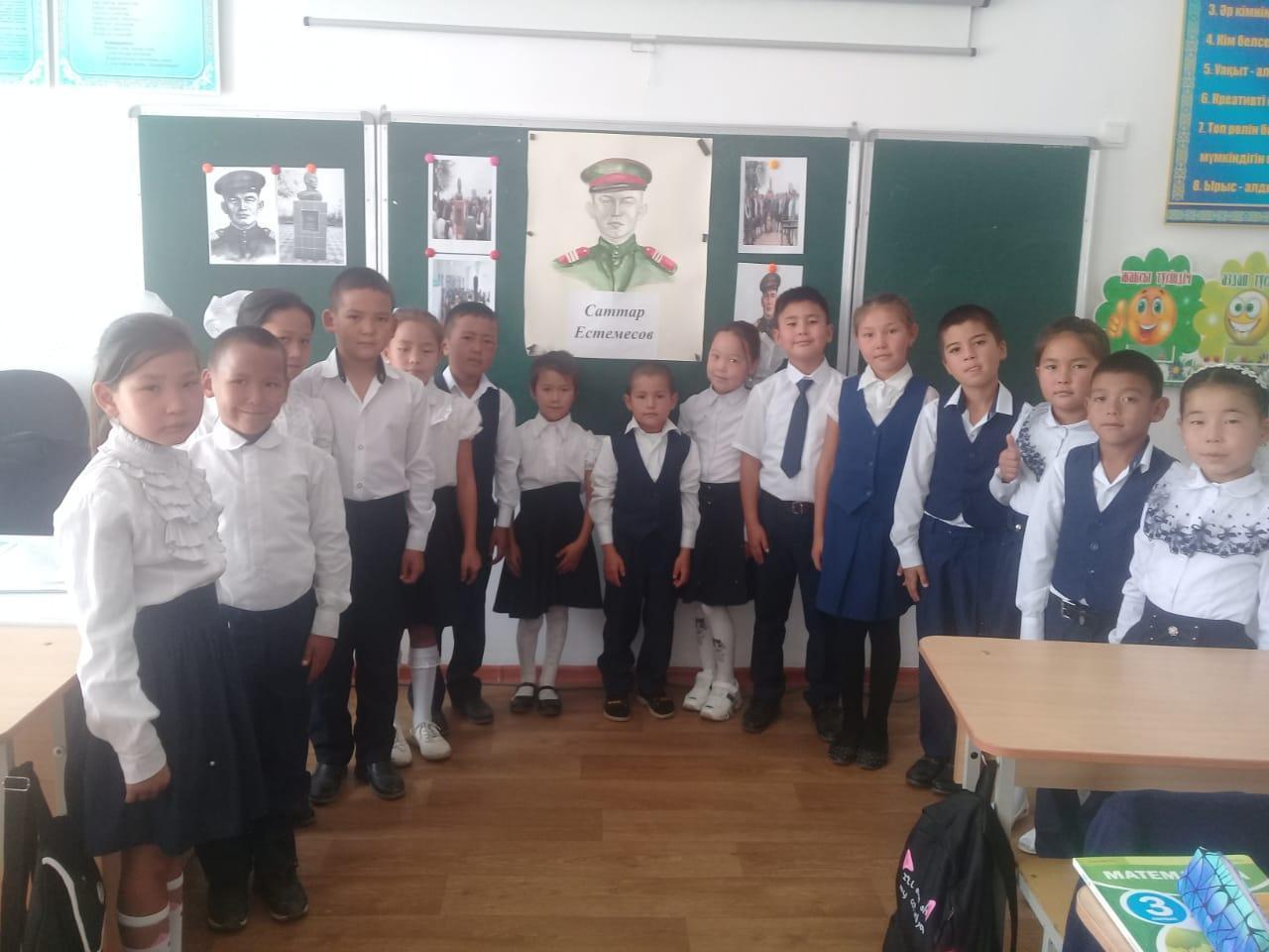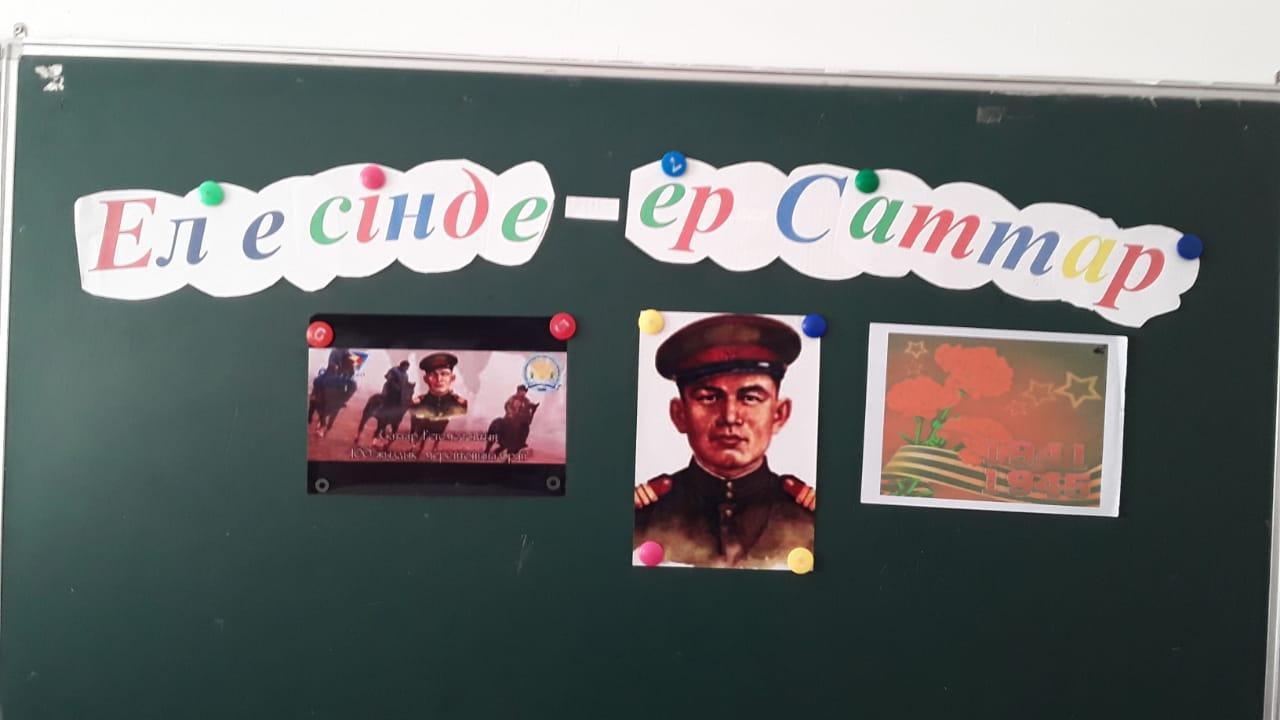 , әр баланың бойында патриоттық сезімдерін ояту мақсатында сынып сағаттары өткізілді.Ұлы Отан соғысында ерлікпен қаза тапқан жерлесіміздің туылғанына 100 жыл толуын аудан көлемінде аталып өтілуі қуантарлық жай.Сынып сағаттарында жерлестеріміз Қ.Кішібаевтың «Саттар туралы балладасы» , «Ескерткіш жанындағы ой» өлеңдері оқылып , Б.Исаеваның «Болмасын соғыс , болмасын» атты әндері шырқалды.