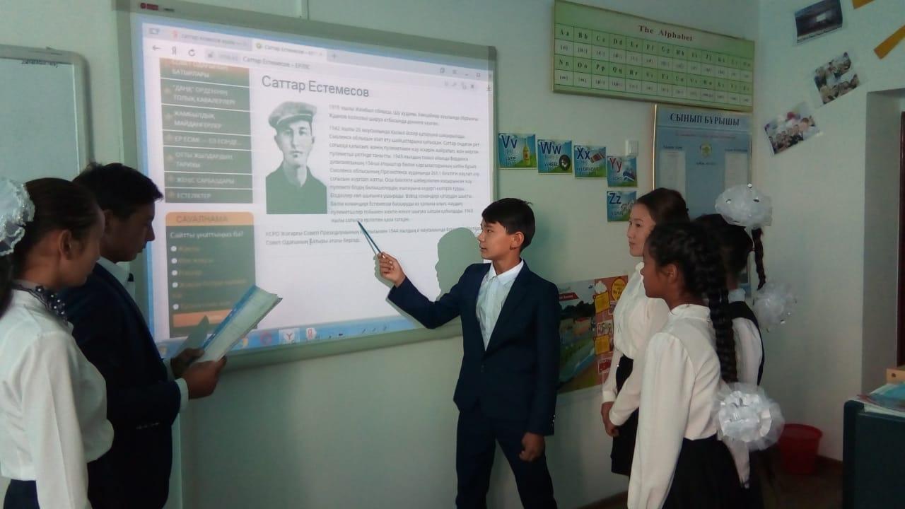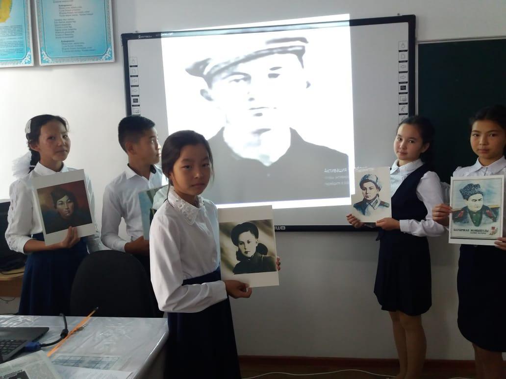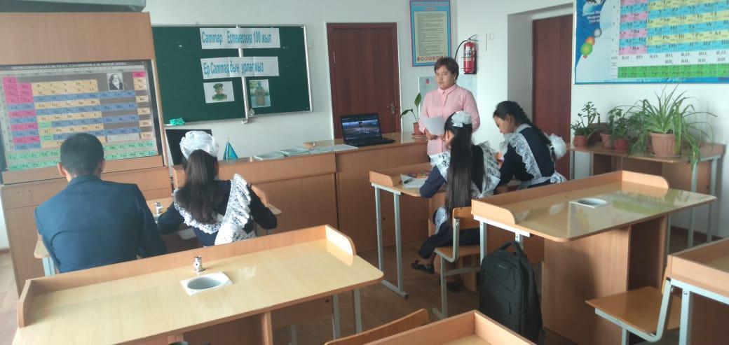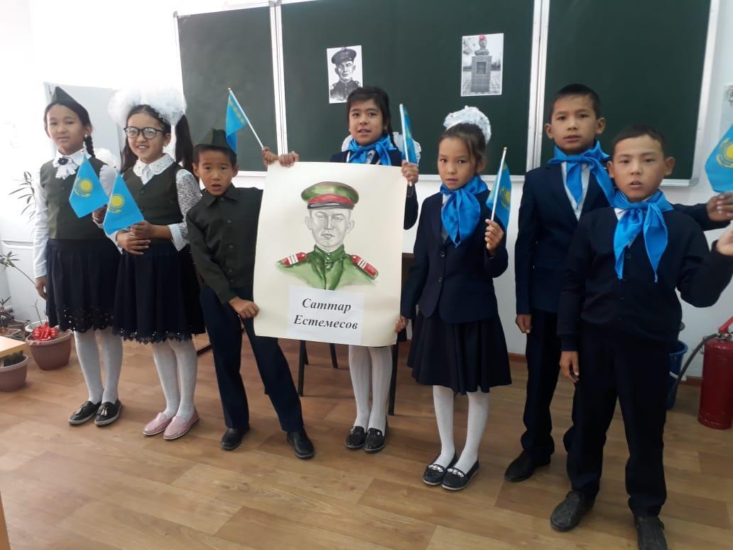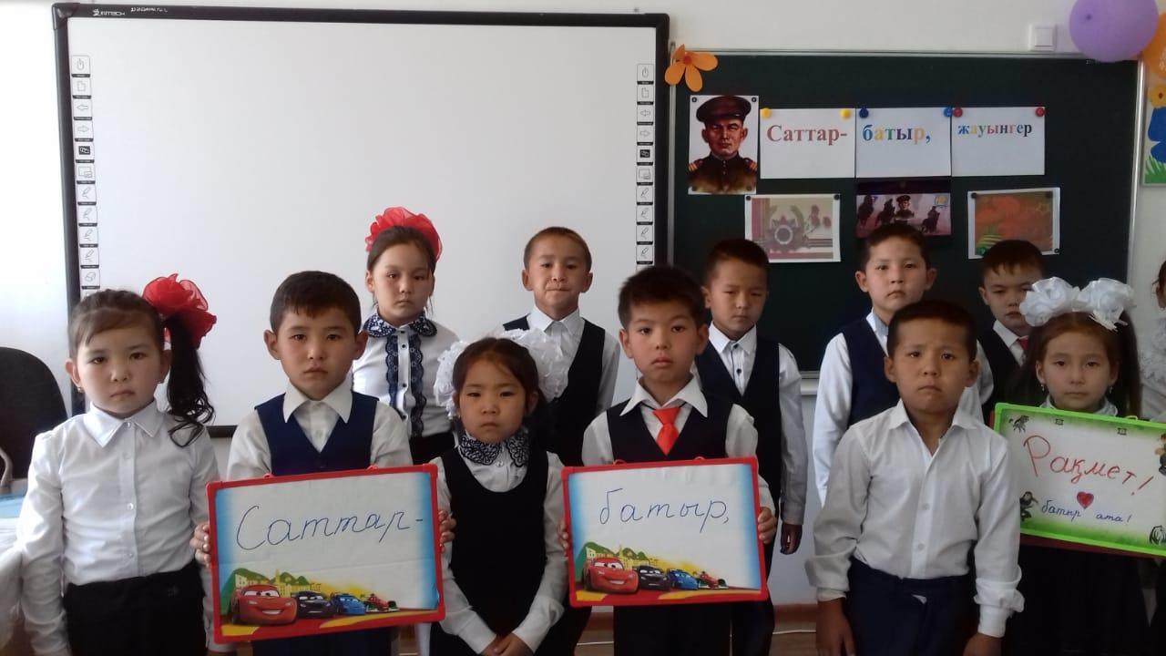 , әр баланың бойында патриоттық сезімдерін ояту мақсатында сынып сағаттары өткізілді.Ұлы Отан соғысында ерлікпен қаза тапқан жерлесіміздің туылғанына 100 жыл толуын аудан көлемінде аталып өтілуі қуантарлық жай.Сынып сағаттарында жерлестеріміз Қ.Кішібаевтың «Саттар туралы балладасы» , «Ескерткіш жанындағы ой» өлеңдері оқылып , Б.Исаеваның «Болмасын соғыс , болмасын» атты әндері шырқалды.