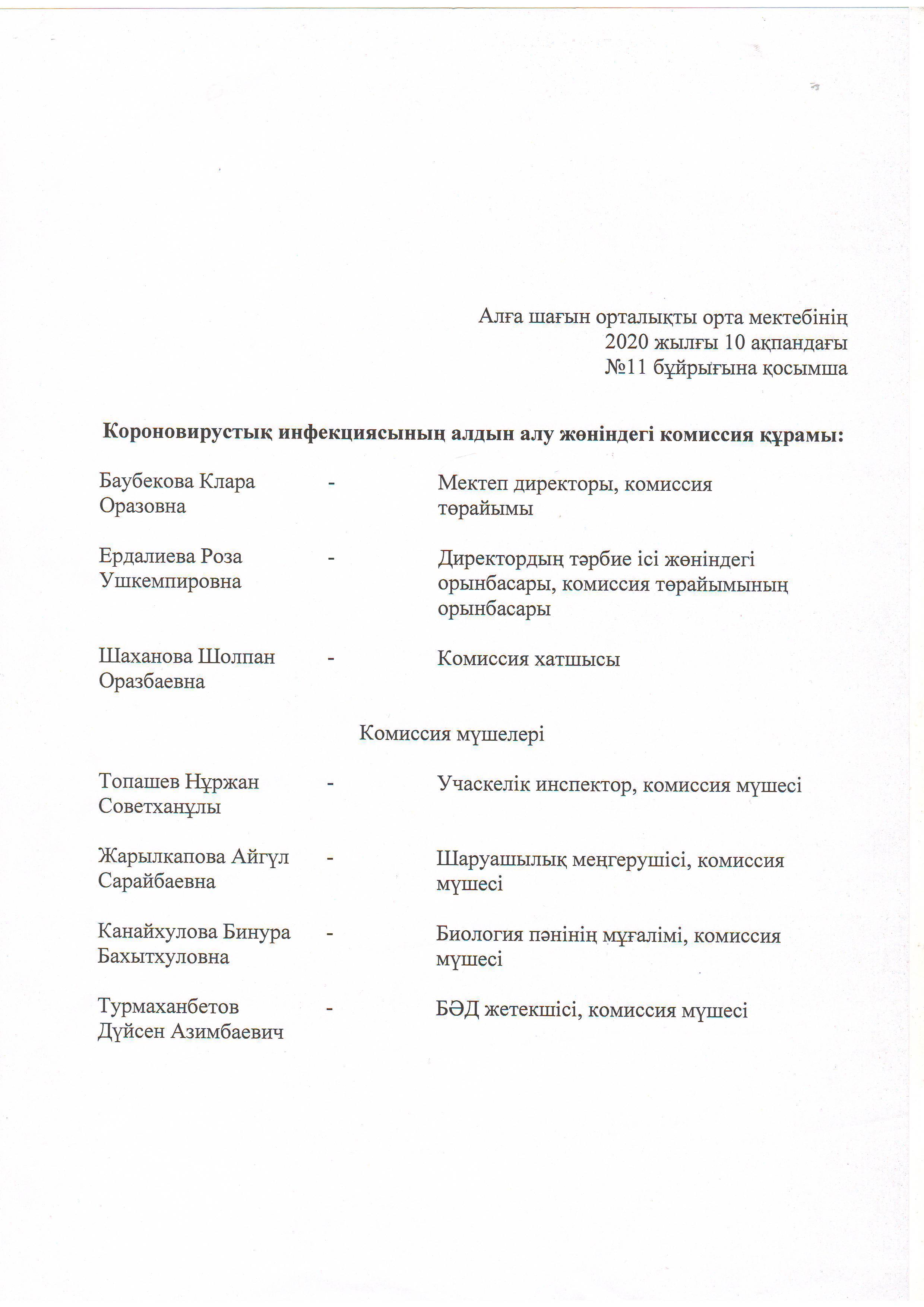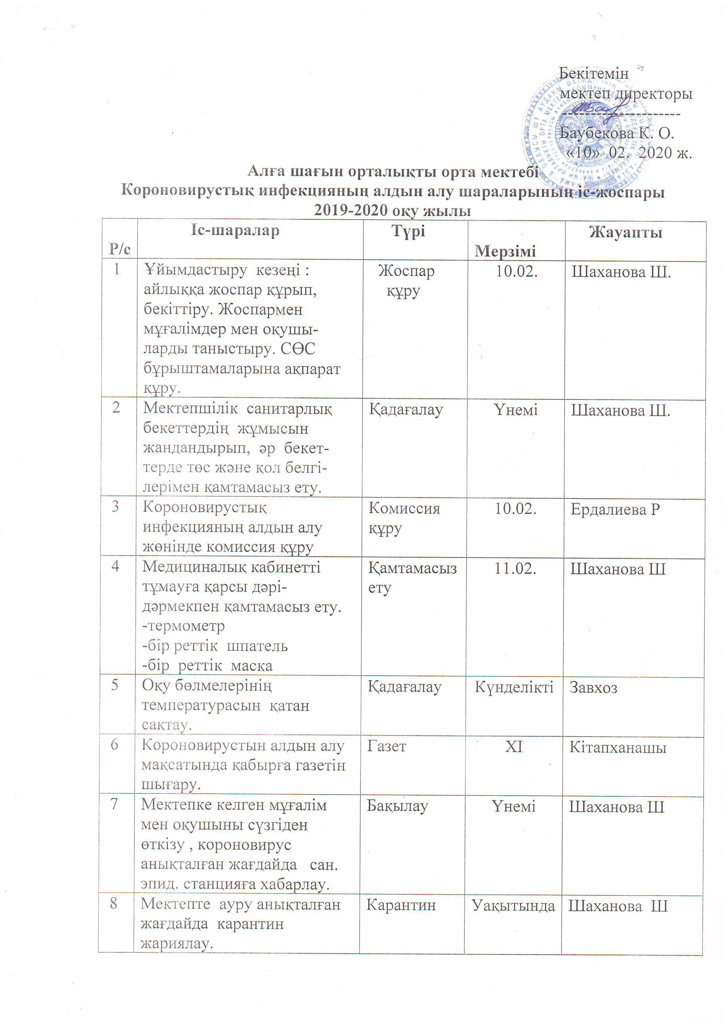 10 февраль 2020 0 1 2 3 4 5 Короновирус туралы Алға шағын орталықты орта мектебінде 10.02.2020 жылы Короновирустық инфекциясының алдын алу жөнінде 7 адаман комиссия құрылды. Іс – шаралар жоспары құрылып , бекітілді.