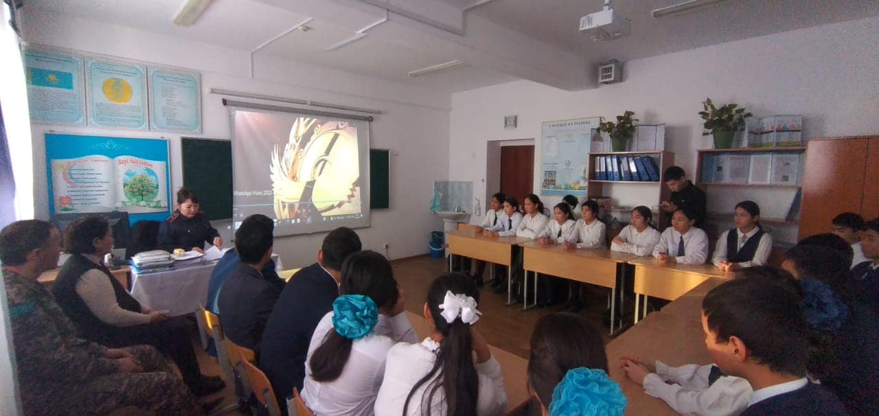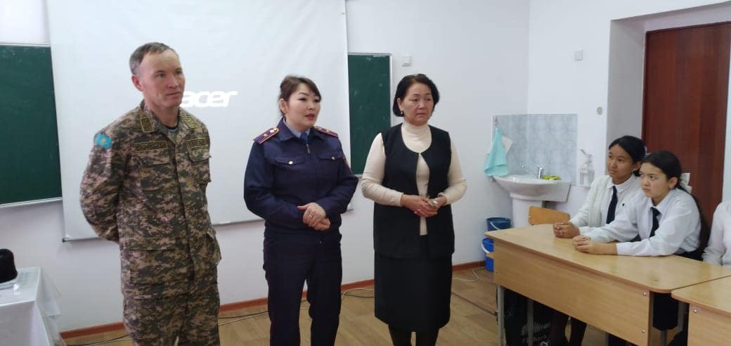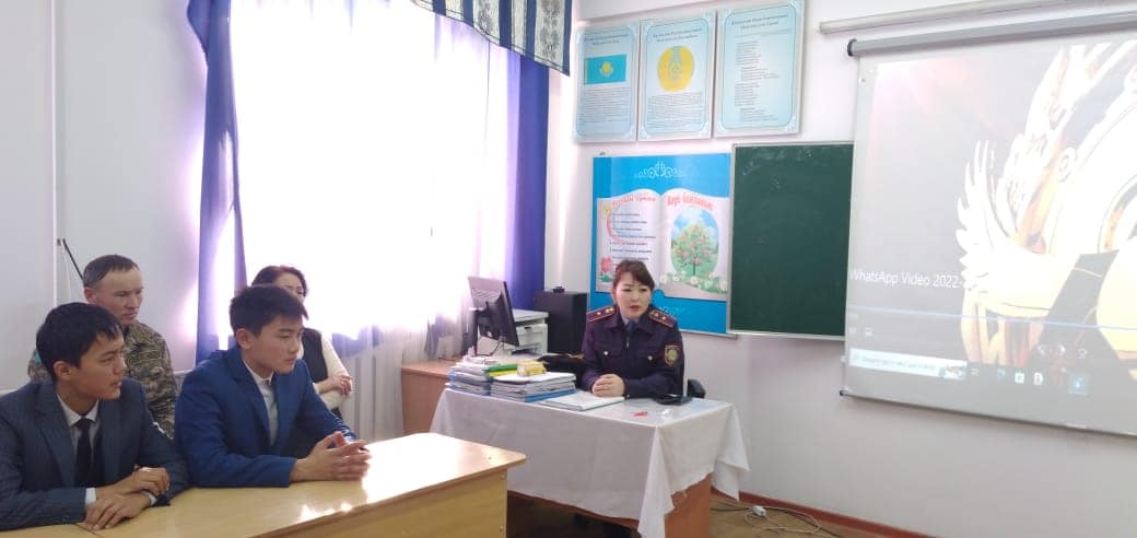 Жамбыл облысы Шу ауданы Сауытбек ауылы Алға орта мектебінде балалар мен жасөспірімдерді ҚК ҚР 188 бабы бойынша құқық бұзушылық пен заң бұзушылықтың қаңғыбастықтың алдын алу,ұрлық болдырмау мақсатында 8,9,10,11 сынып білім алушылар арасында Шу АПБ-нің ЖПҚ УПИ ЮПТ аға инспекторы полиция майоры Мусабек Айсұлу Баракқызы бейне роликтер көрсетіп,оқушылармен әңгіме-сұхбат жүргізді.