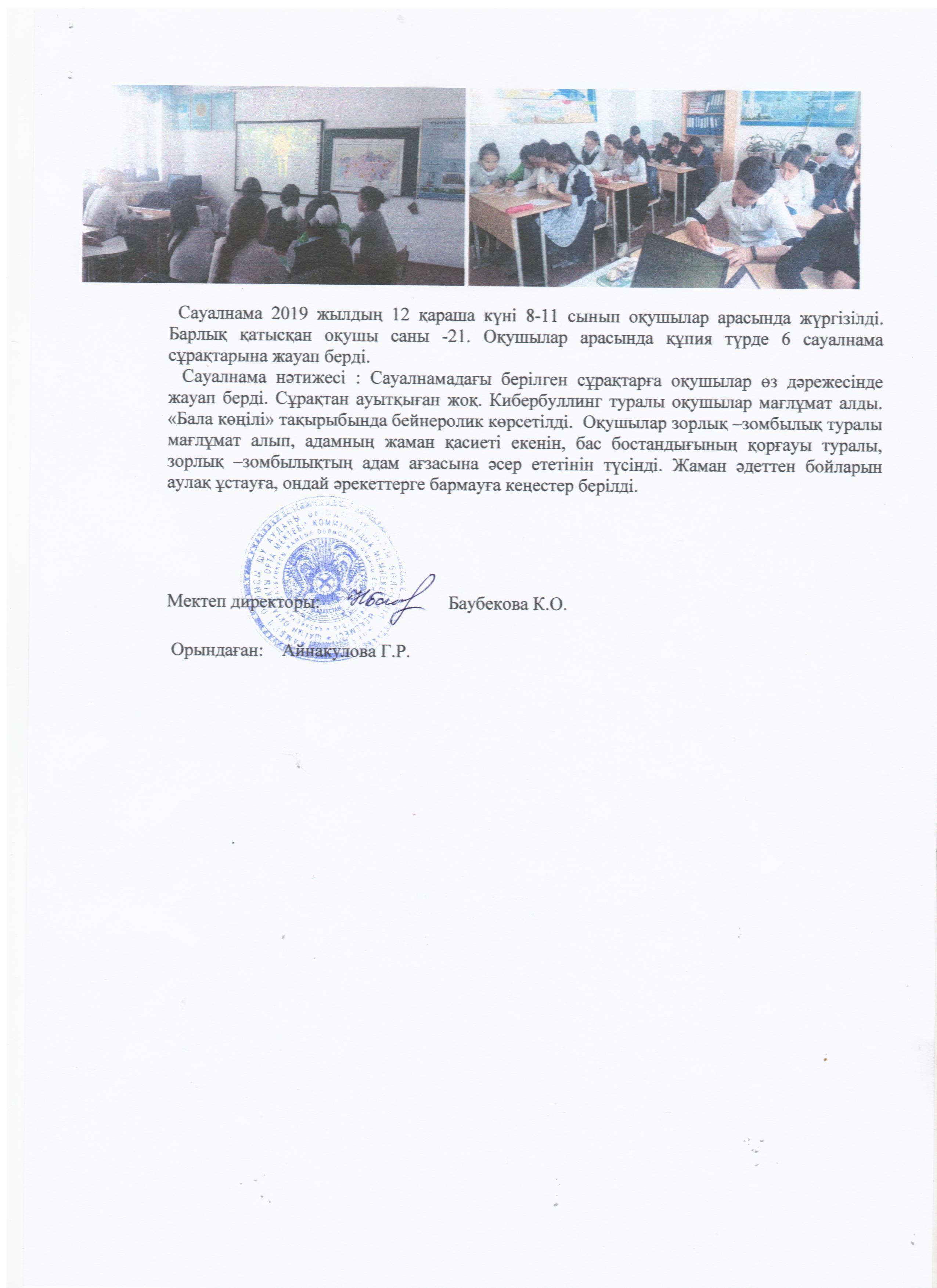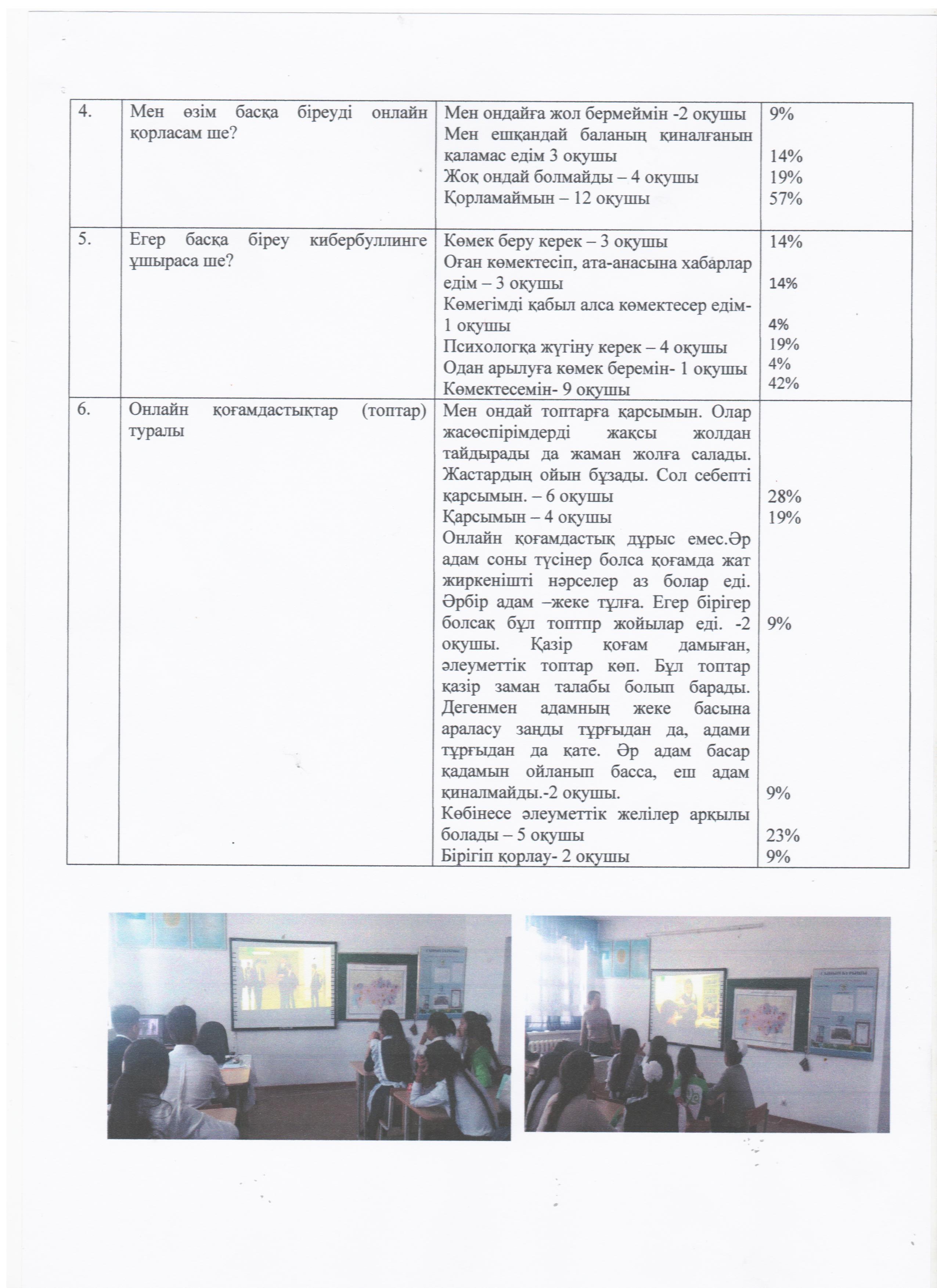 Алға шағын орталықты орта мектебінде 8-11 сынып оқушылары арасында "Зорлық - зомбылық, Кибербуллингтің алдын алу" және оған қарсы әрекет ету мәселелерін зерттеуге бағытталған жасырын әлеуметтік сауалнамасының қорытындысы.