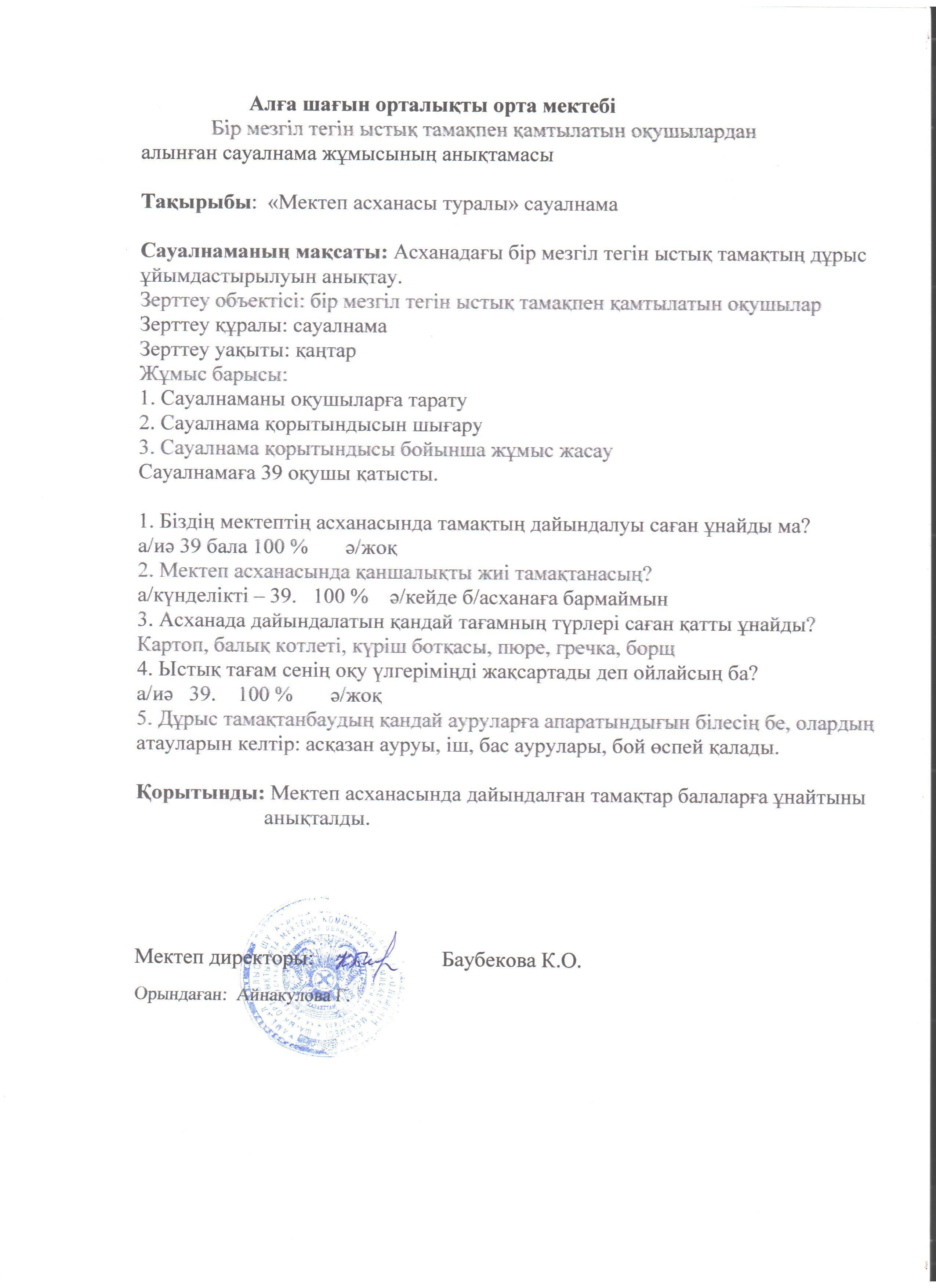 11 февраль 2020 0 1 2 3 4 5 Мектеп асханасы акциясы «Мектеп асханасы» республикалық акциясының барысында жоспар бойынша мектеп психологі Г.Айнакулова «Мектеп асханасы туралы сауалнама» алынды. Сауалнама қорытындысы бойынша оқушылардың мектеп асханасында дайындалған тамақтардың ұнайтыны анықталды.