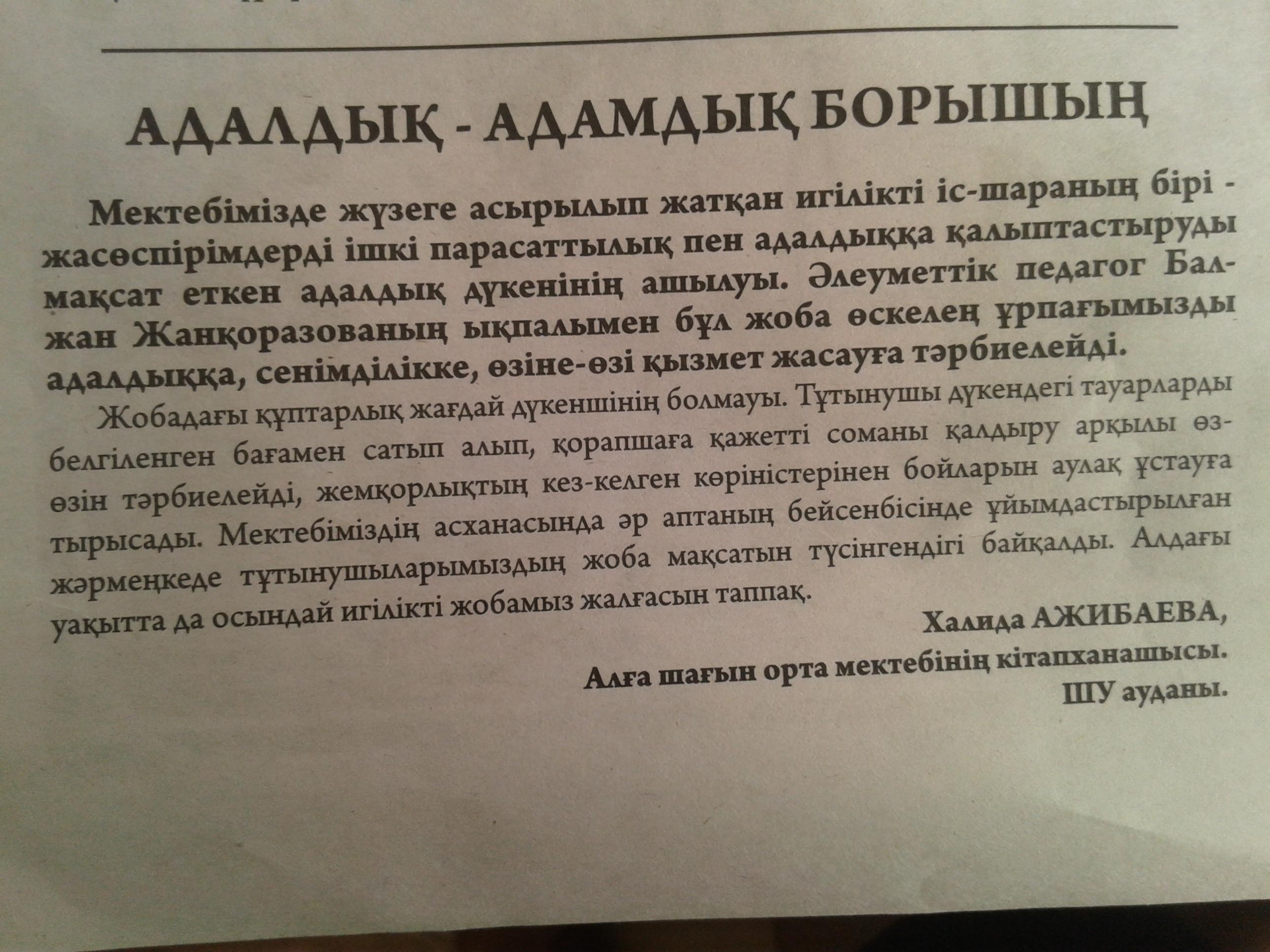 "Адалдық - адамдық борышың" мақаласы » Алға шағын орталықты орта мектебі